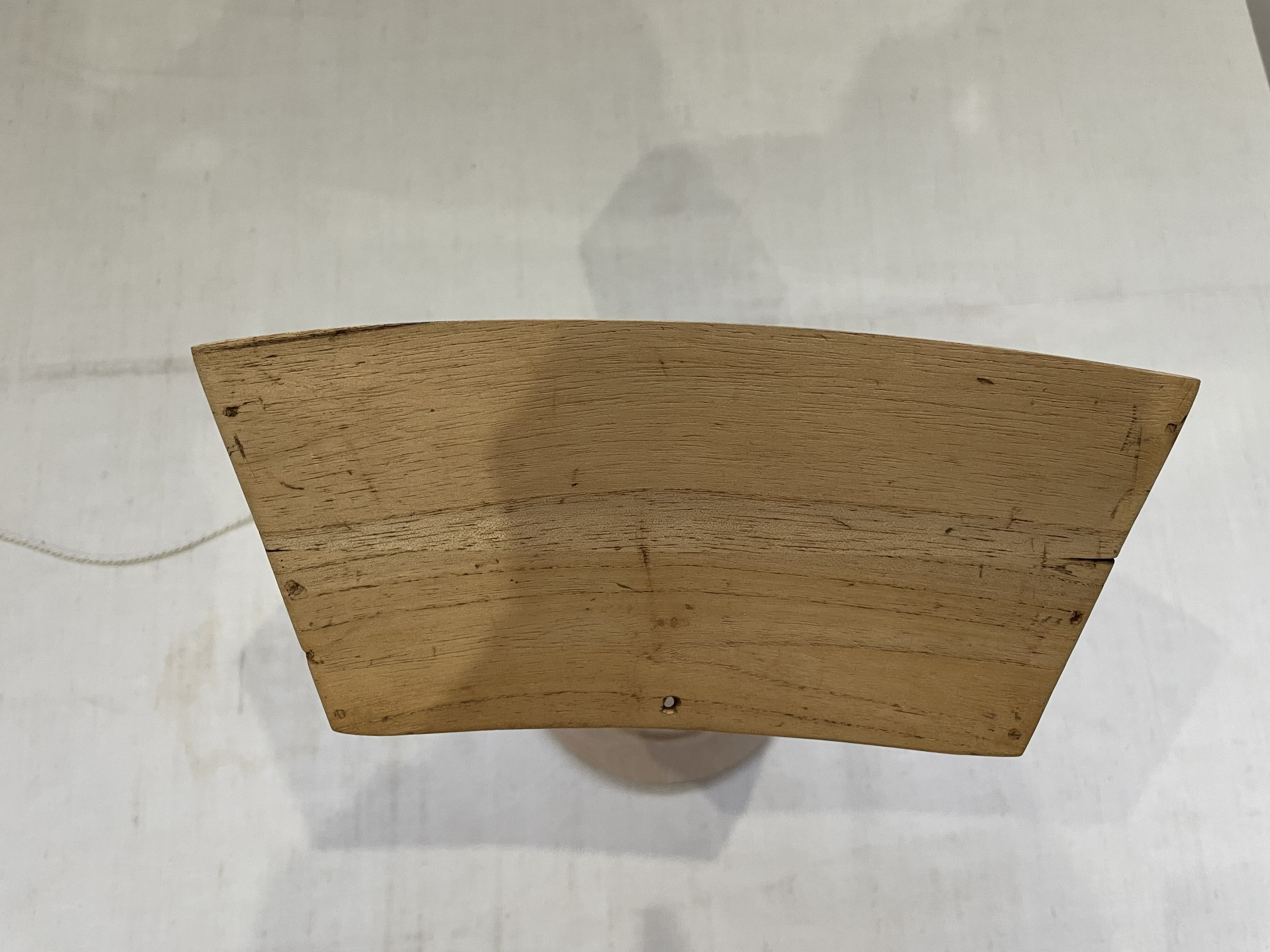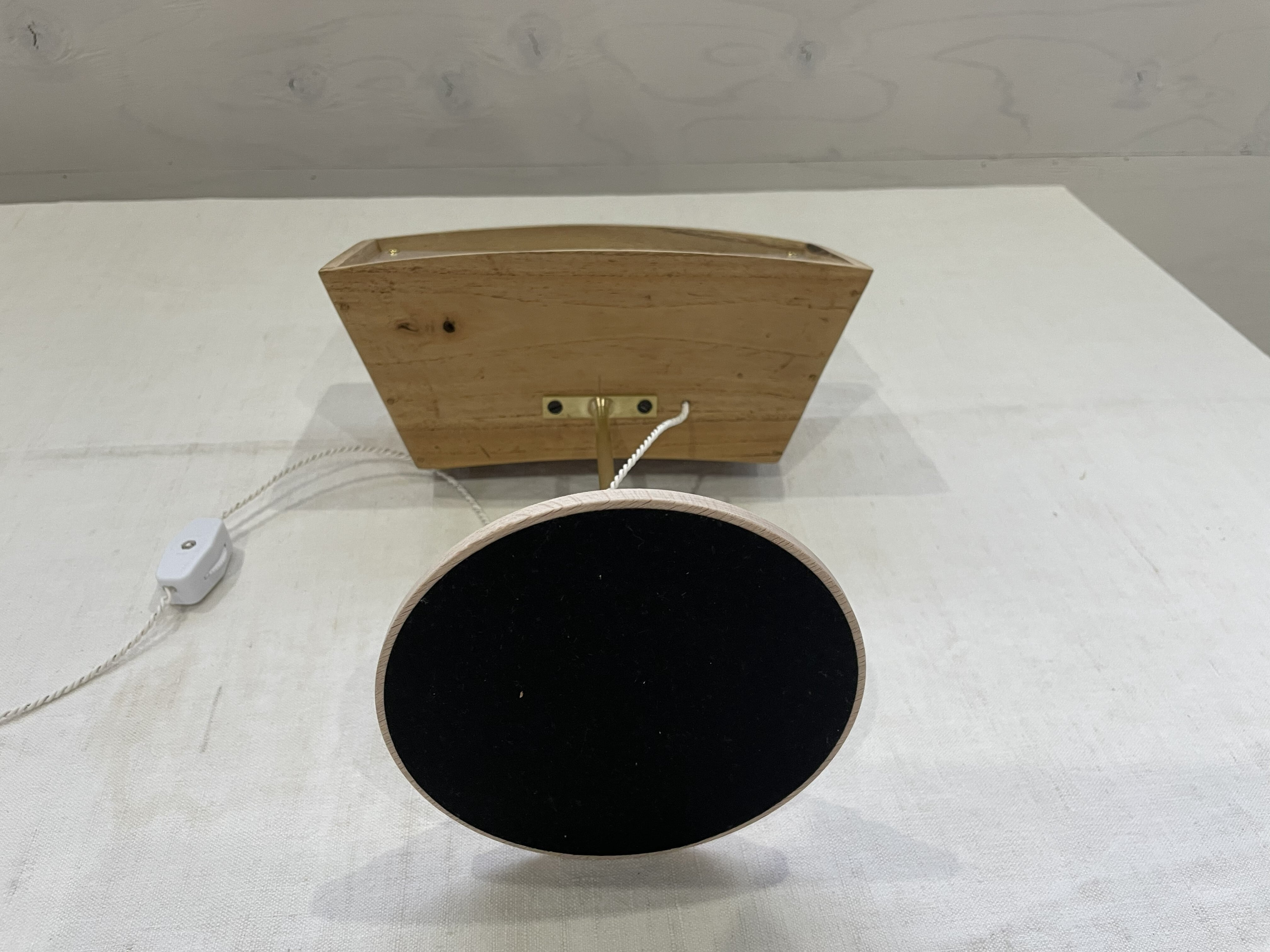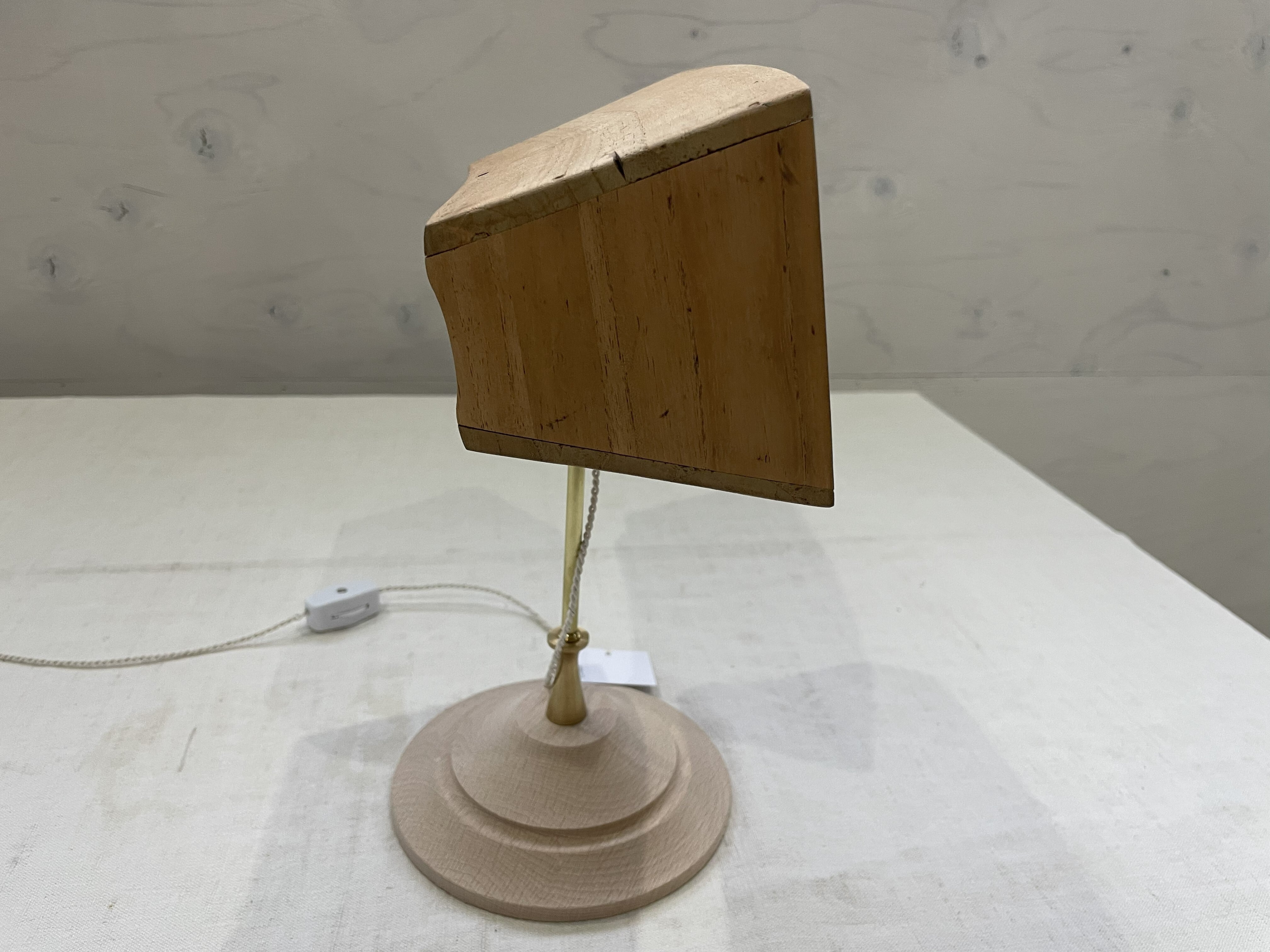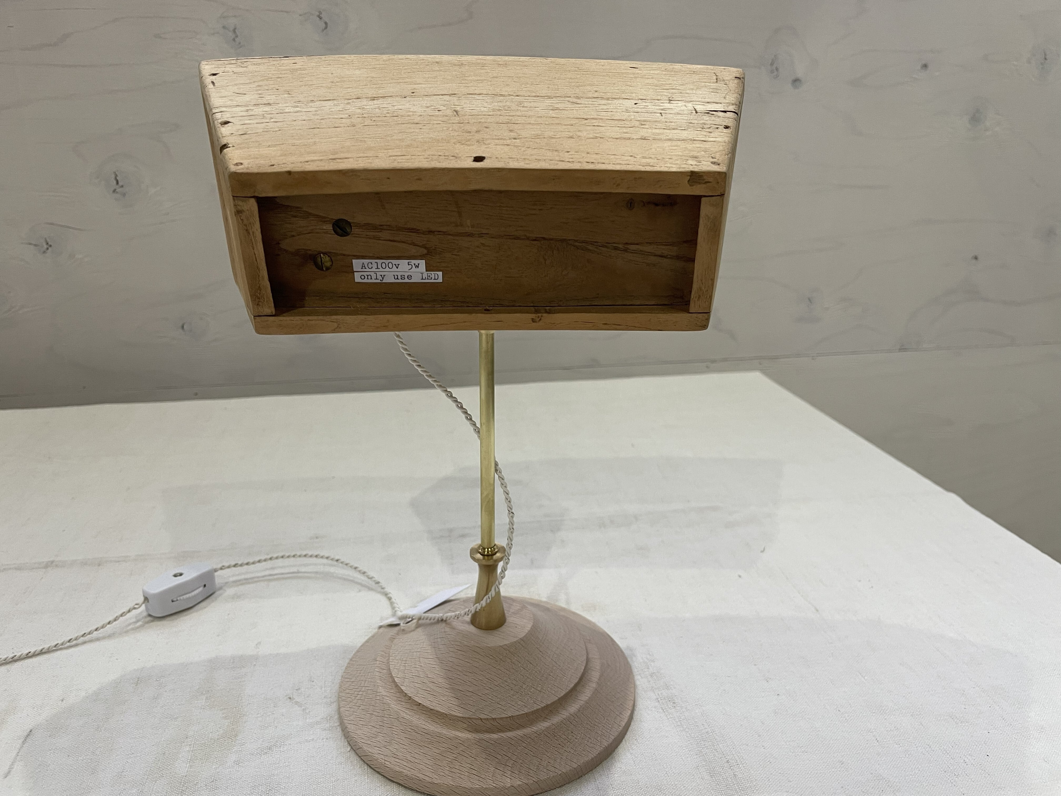丸い木台座から真鍮のパイプが伸び、横長の古い木箱シェードが両面から光を放ちます。