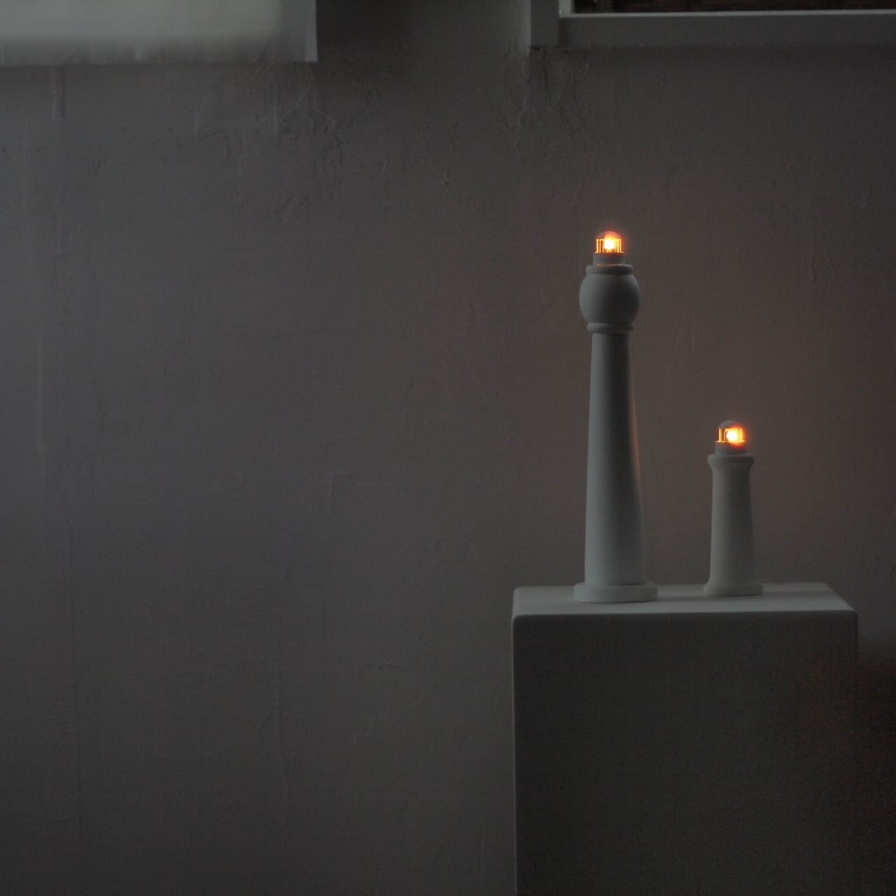 灯すと、小さな燈楼部分から光が漏れ、まるで夜の海に立つ灯台のよう。
