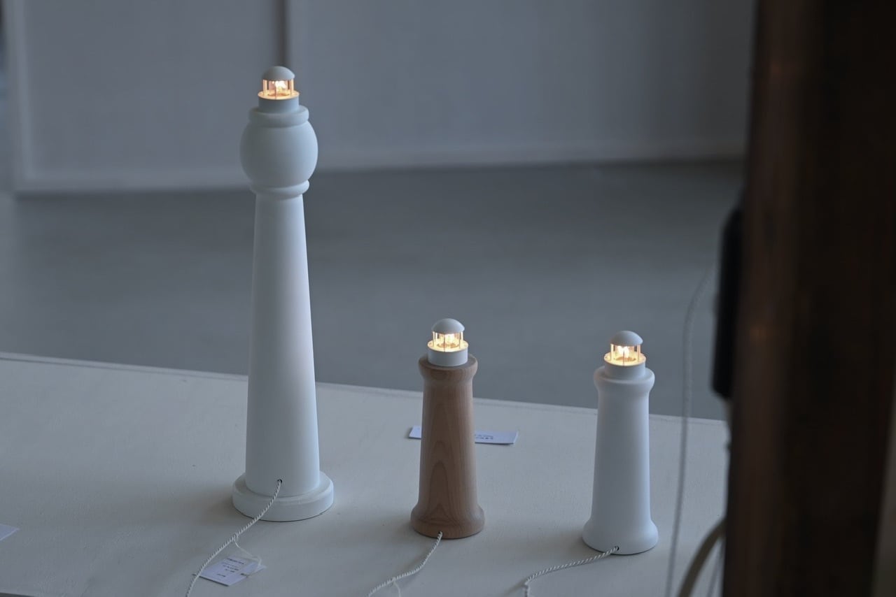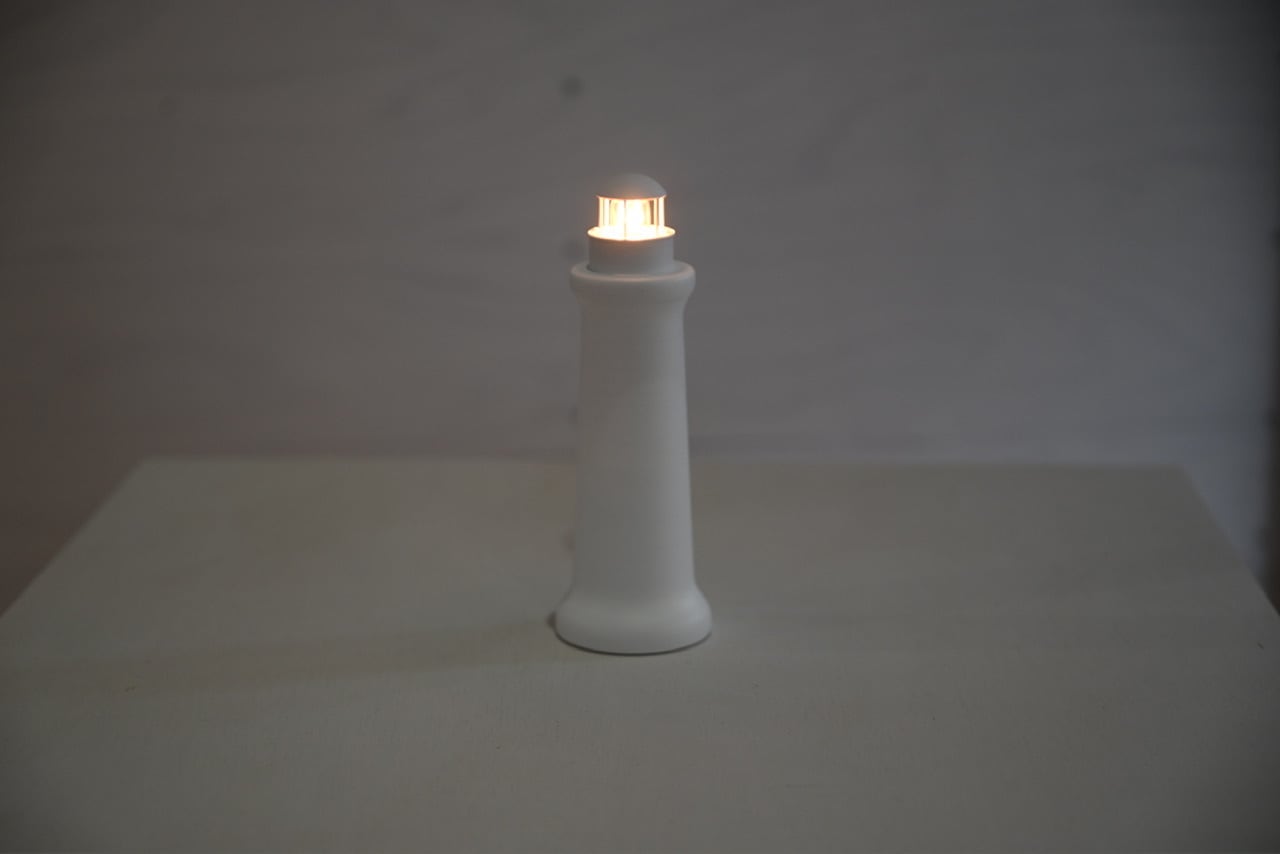 手のひらに収まるほどの小さな白い灯台が、卓上にひっそりと灯ります。