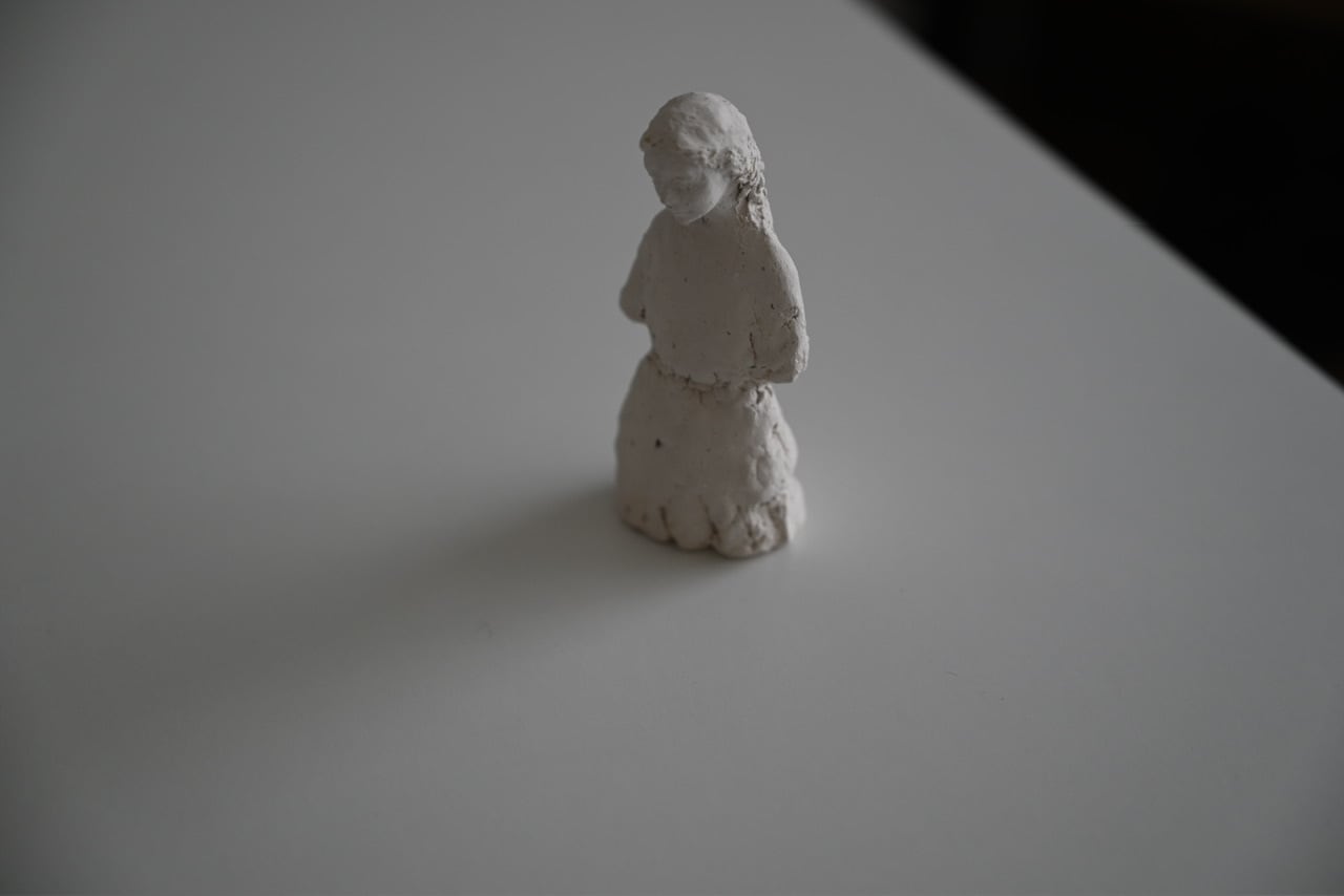 焼成はせず、乾燥により完全に固まります。重量は石よりも軽く、白色度の高い素材です。 制作時は柔らかく 乾燥によって固まり、石のように硬くなります。 磨くとツヤがでます。