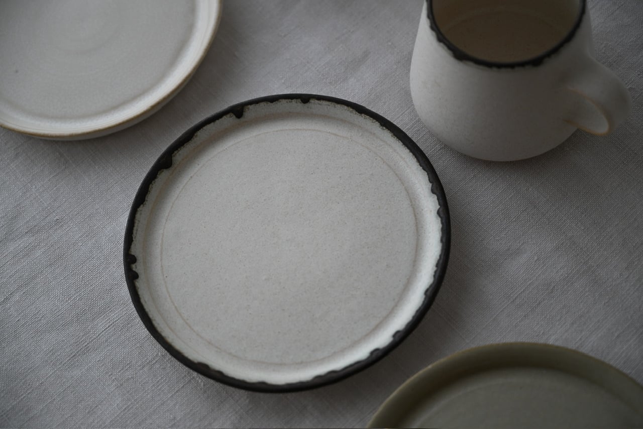 縁錆は白マットに縁に黒のデザインが入っています。境界は滲みが出ていてそれも魅力的な表情です。縁錆の流れ方はひとつひとつ表情が異なります。