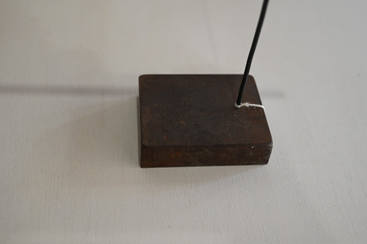 鉄の台座からすっと伸びる細いロッド、その先に掲げられた木のボード。