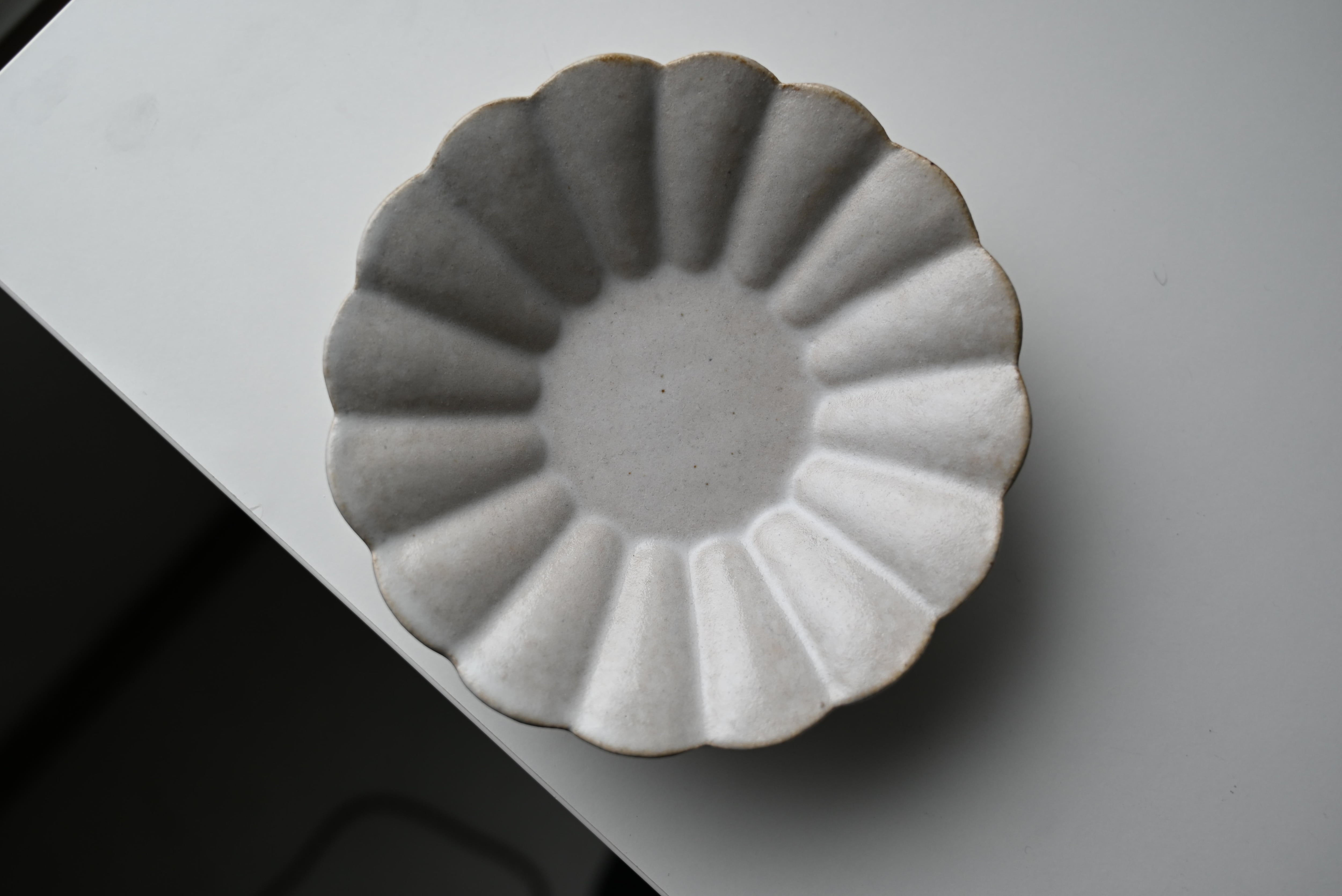 こちらは輪花皿。16輪の模様がふっくらと感じるほとなめらかに丁寧につくられています。