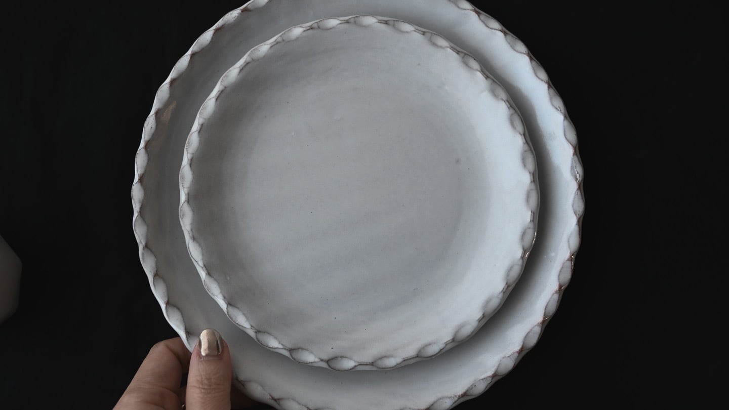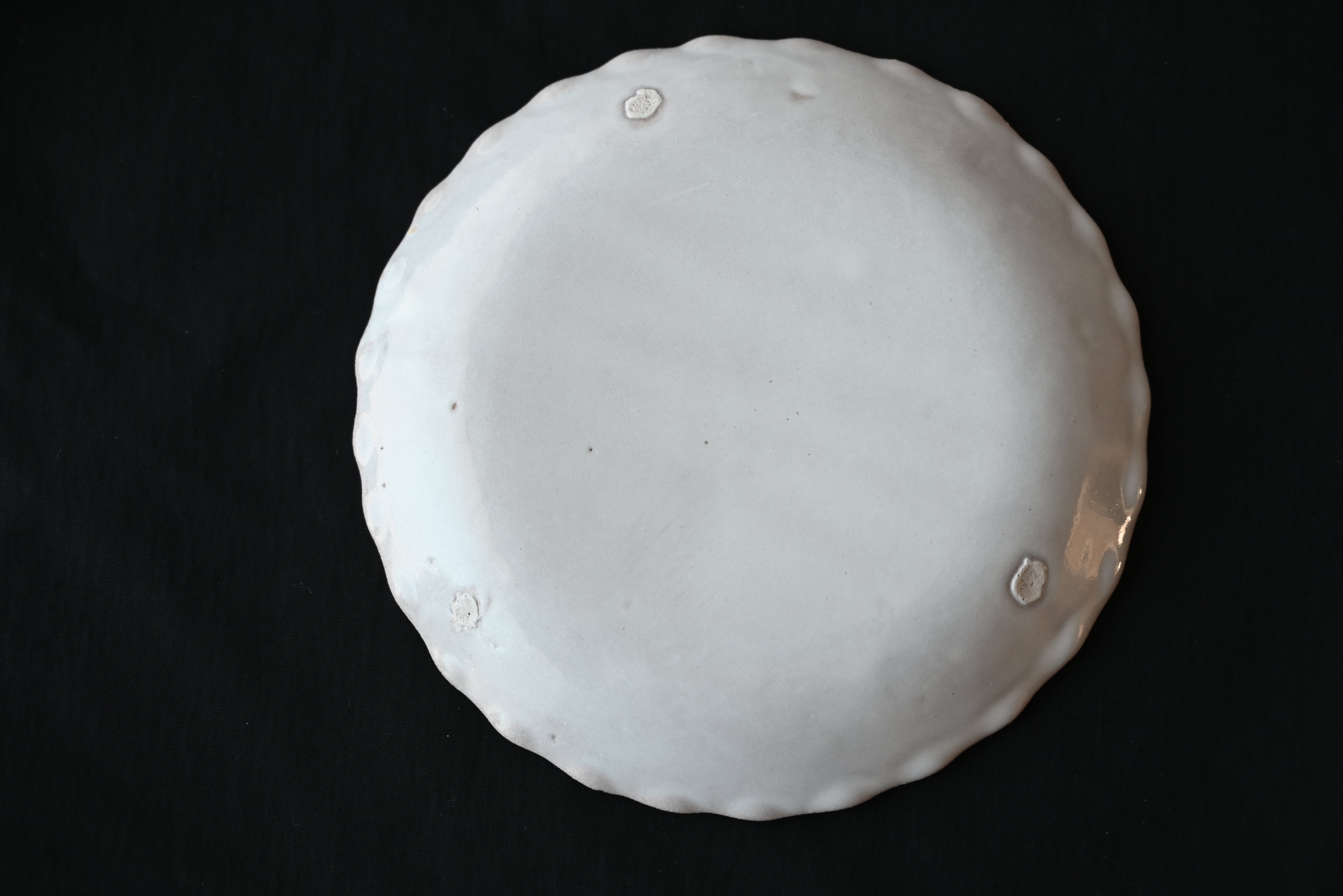 丸平皿の縁の装飾は木の棒や貝殻を使って上から押し込んで仕上げています。