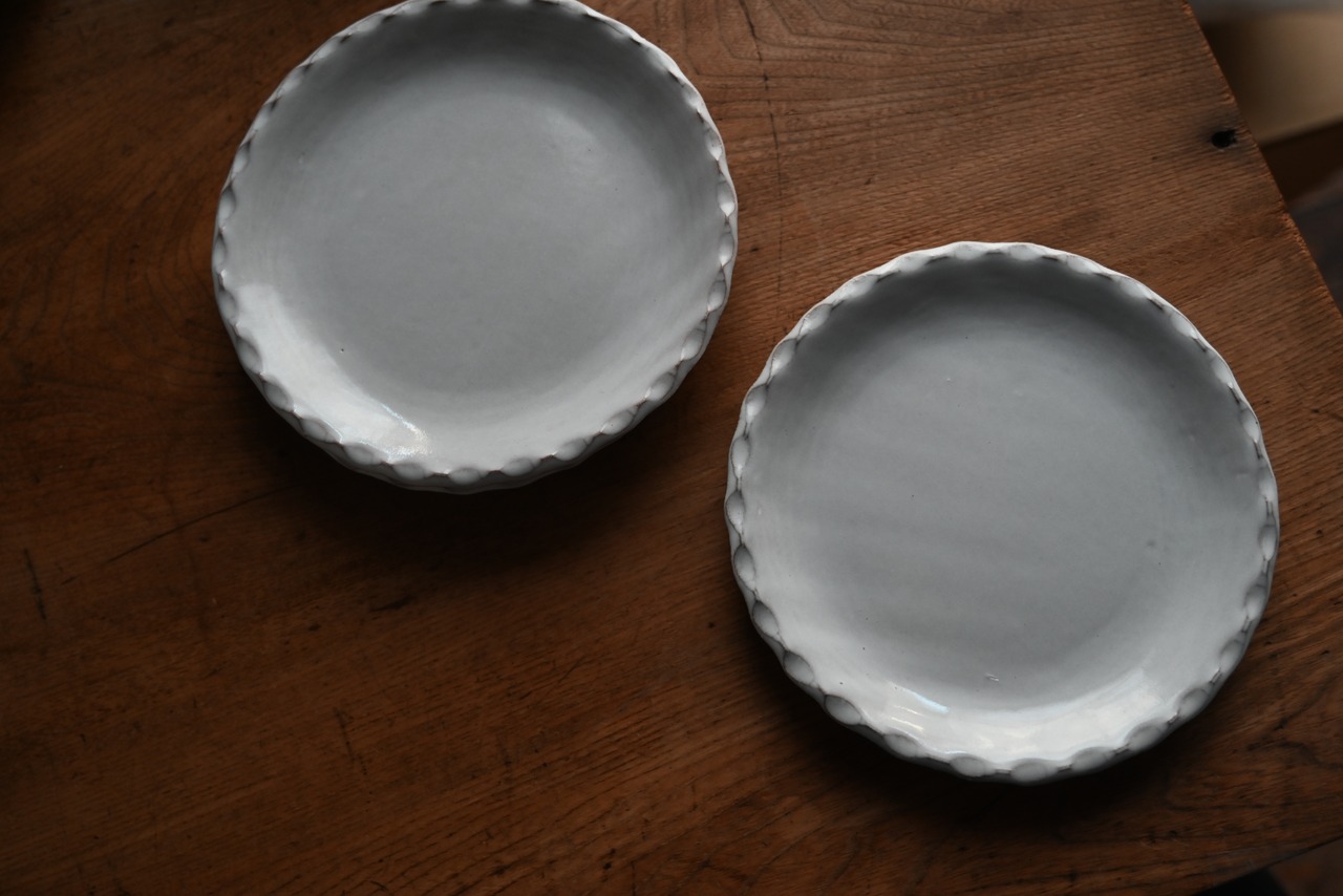 手仕事のため、釉ダレや釉薬のかかりのムラ(縁の装飾の影響により線状に色ムラが現れている箇所もございます)、歪み、個体差が見られますが、それらはあじわいとなり、ご選択は不可となります。
